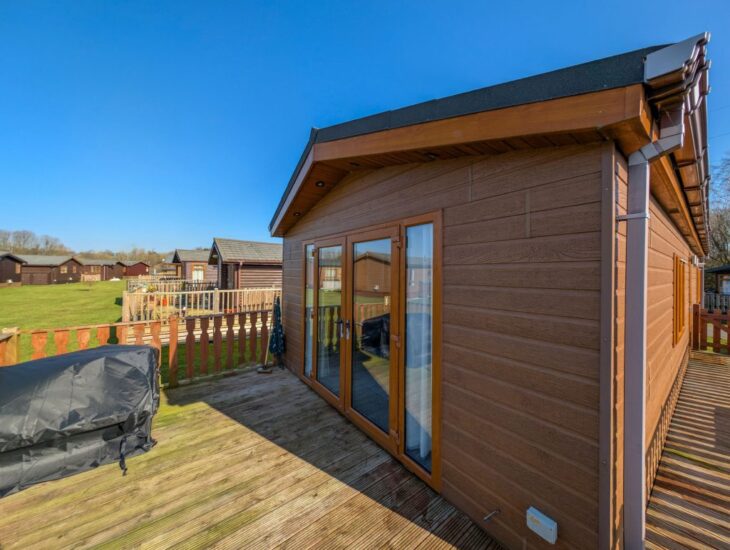 The large gated decking area is ideal for enjoying the sunshine or dining al fresco. With partial views of the lake, garden furniture (table & 4x chairs).