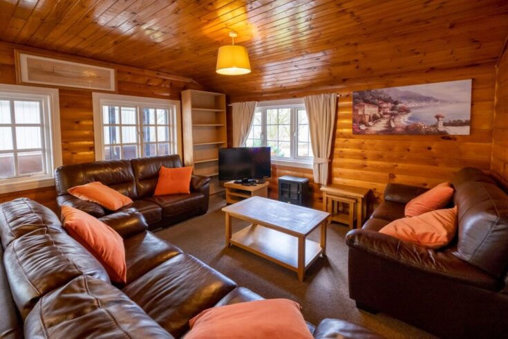 The living room and kitchen diner is an open-plan layout, and showcases two sizeable sofas and an armchair – ideal for a games night for all the family. There is also a large dining table seating up to 8 people alongside a TV with Freeview channels, scart & HDMI sockets and DVD player.