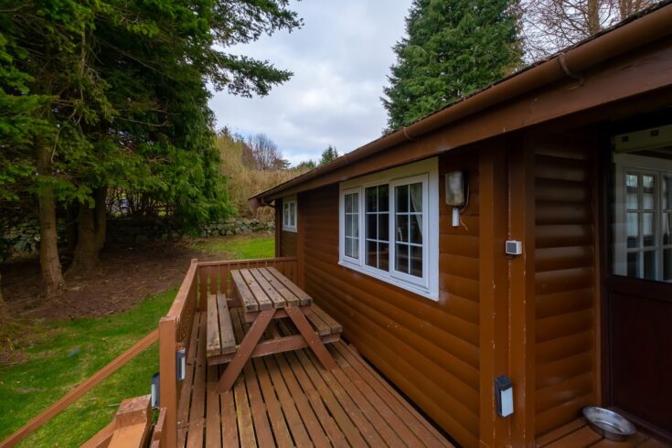It has a decking to the side of the cabin with a gate, an open-plan grass area around the cabin, and parking directly in front of Cabin 145 for up to 2 cars.