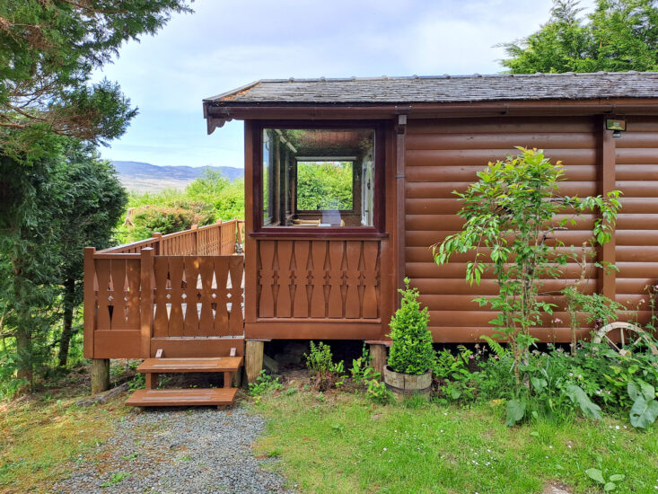 It has a narrow decking to the front and a larger more private decked area to the side with good views towards the Rhinog Mountains. There is a small grass area to the side of the cabin and parking is directly beside the cabin.