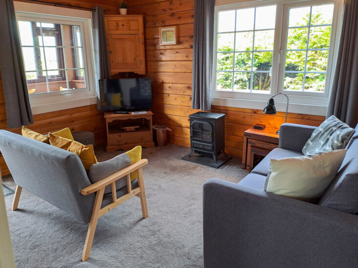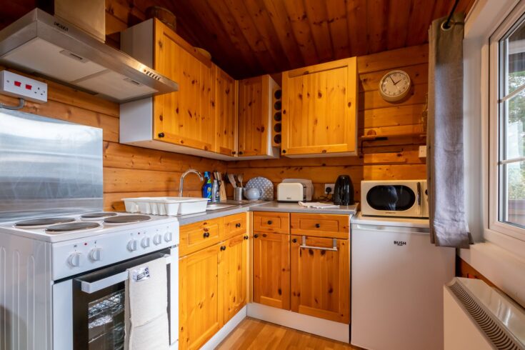 The living area is open plan with the kitchen and has a 2 seater sofa plus 2 small easy chairs and a TV with Freeview channels and a DVD player. The kitchen has all the normal kitchen appliances including an oven, a fridge with ice box and microwave. We are now offering cleaning materials in each cabin to ensure a comfortable stay with us. These include: Tea towels, dish cloths, sponge scourers, and anti-bac spray.