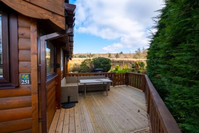 Cabin 251 has recently been completely renovated and is a 2-bedroom self-catering log cabin sleeping up to 4 people. It is located on the southern edge of the holiday village providing fantastic views of the Rhinog Mountains from the veranda and private garden area to the rear.