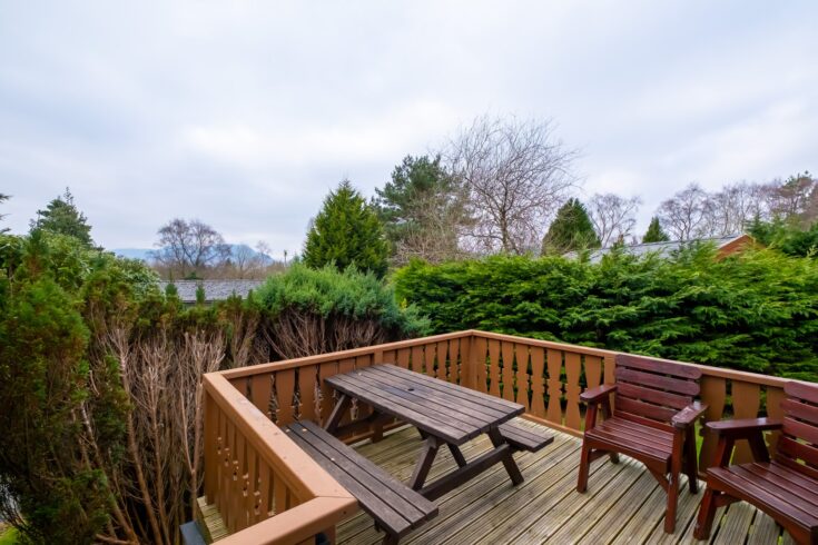 It has a large gated decked area with some views up to the Rhinog Mountains, a large garden around the cabin and parking is directly to the side of the cabin.