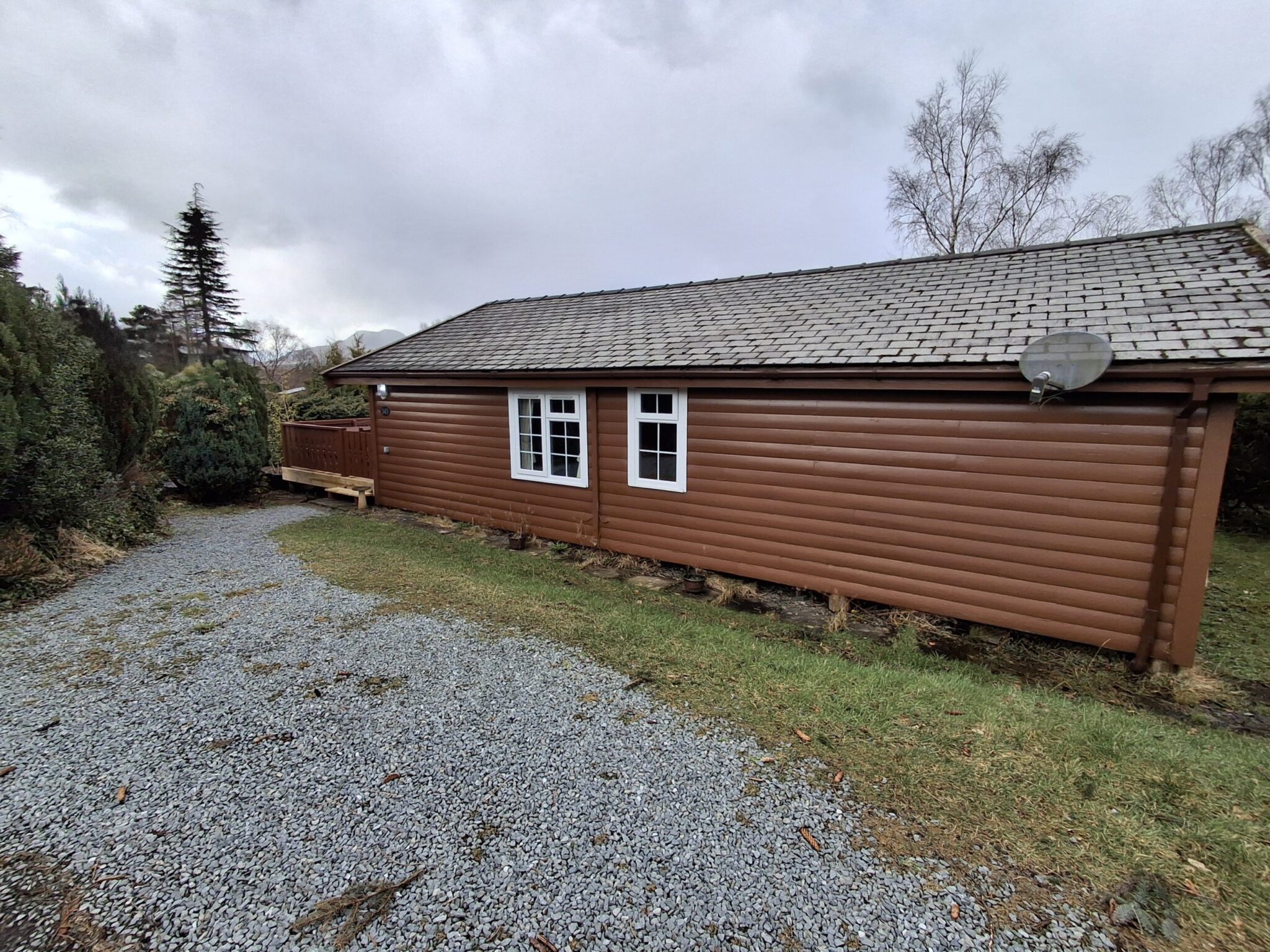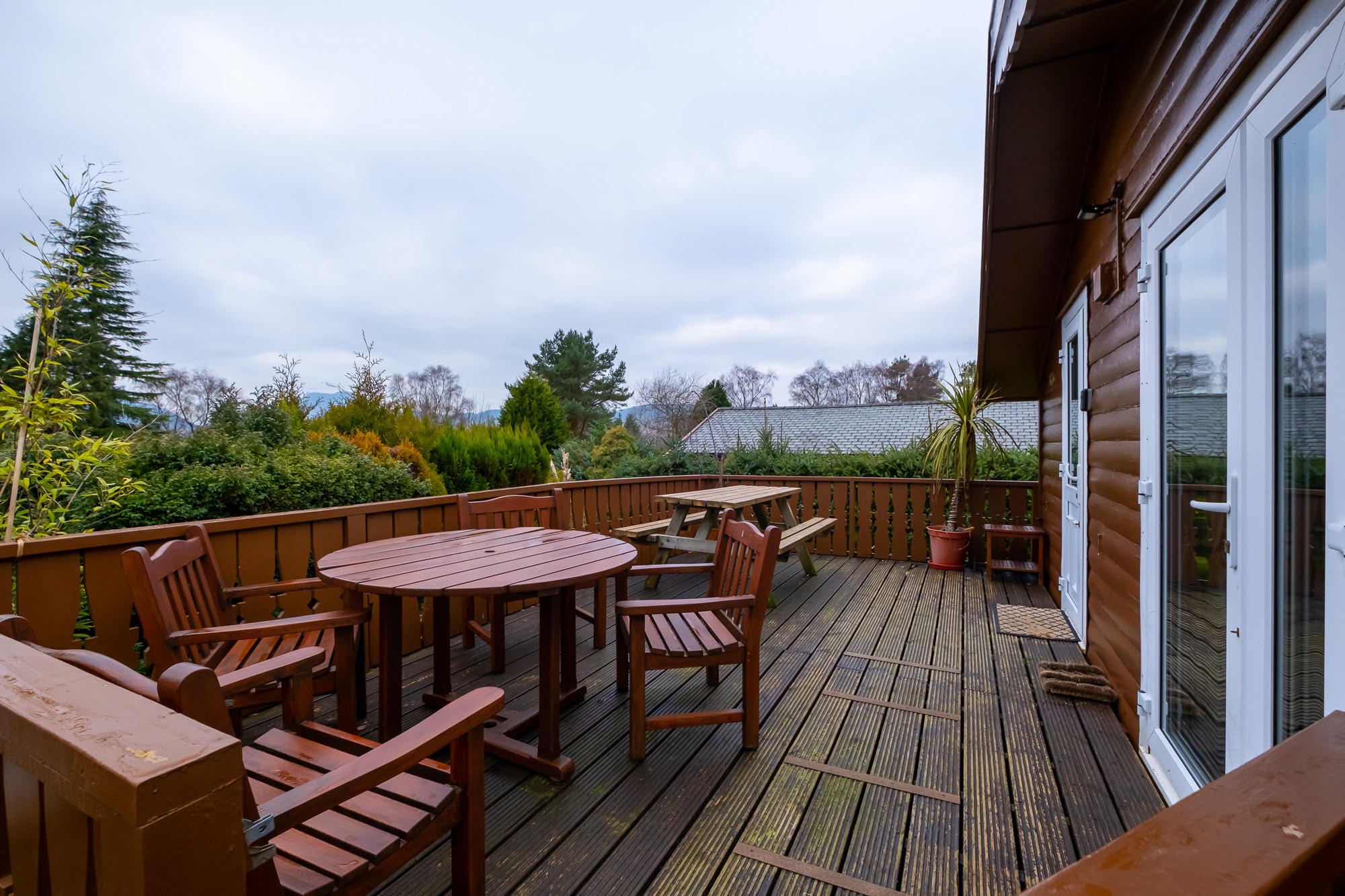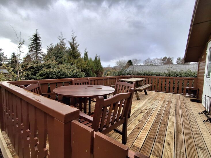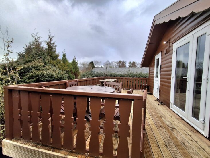 It has a large gated decked area with some views up to the Rhinog Mountains, some grass to the side and there is parking for 2 cars directly next to the cabin (one either side of cabin).