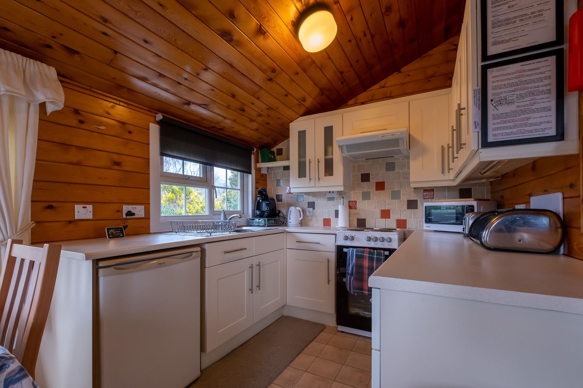 The lounge features patio doors leading out onto the decking, making the cabin feel nice and light during the long summer days. The lounge also encompasses two 3-seater sofas and a TV with basic Freeview channels, scart socket and DVD player. The modern kitchen-diner has a dining table and 6 chairs as well as all standard kitchen appliances including an oven with separate grill, a fridge with ice box and a microwave. We are now offering cleaning materials in each cabin to ensure a comfortable stay with us. These include: Tea towels, dish cloths, sponge scourers, and anti-bac spray.