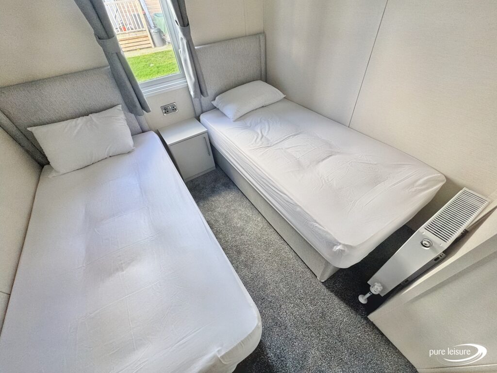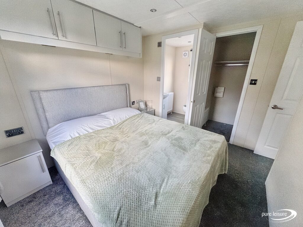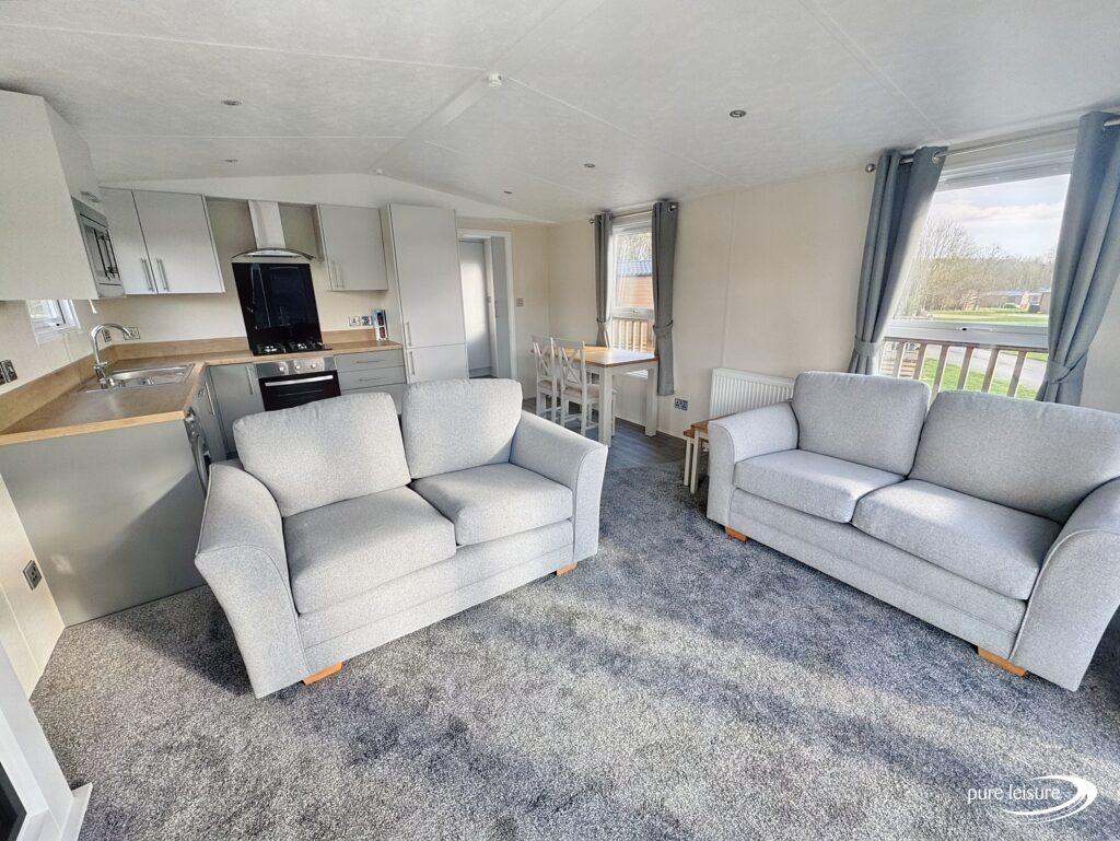 Discover the Beverley Troon, a spacious and stylish holiday home designed for ultimate comfort and relaxation. This 41×14 model features three well-appointed bedrooms, two modern showers. And comfortably sleeps up to six guests, making it perfect for families or groups. Enjoy the interior décor, with large windows and patio doors that flood the space with natural light. The inviting living area boasts a cosy gas fireplace and comfortable free-standing furniture, ideal for relaxing after a day of exploring. The open-plan living space seamlessly integrates a dining area and a modern kitchen, perfect for entertaining. The bedrooms are generously sized, with the master bedroom featuring a walk-in wardrobe and a luxurious en-suite shower room. Overhead cabinets throughout provide ample storage for all your belongings.